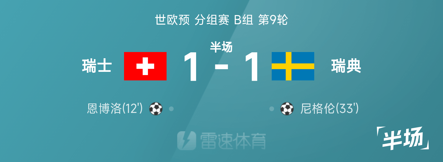 世欧预半场:恩博洛破门,尼格伦扳平局,瑞士暂1-1瑞典
