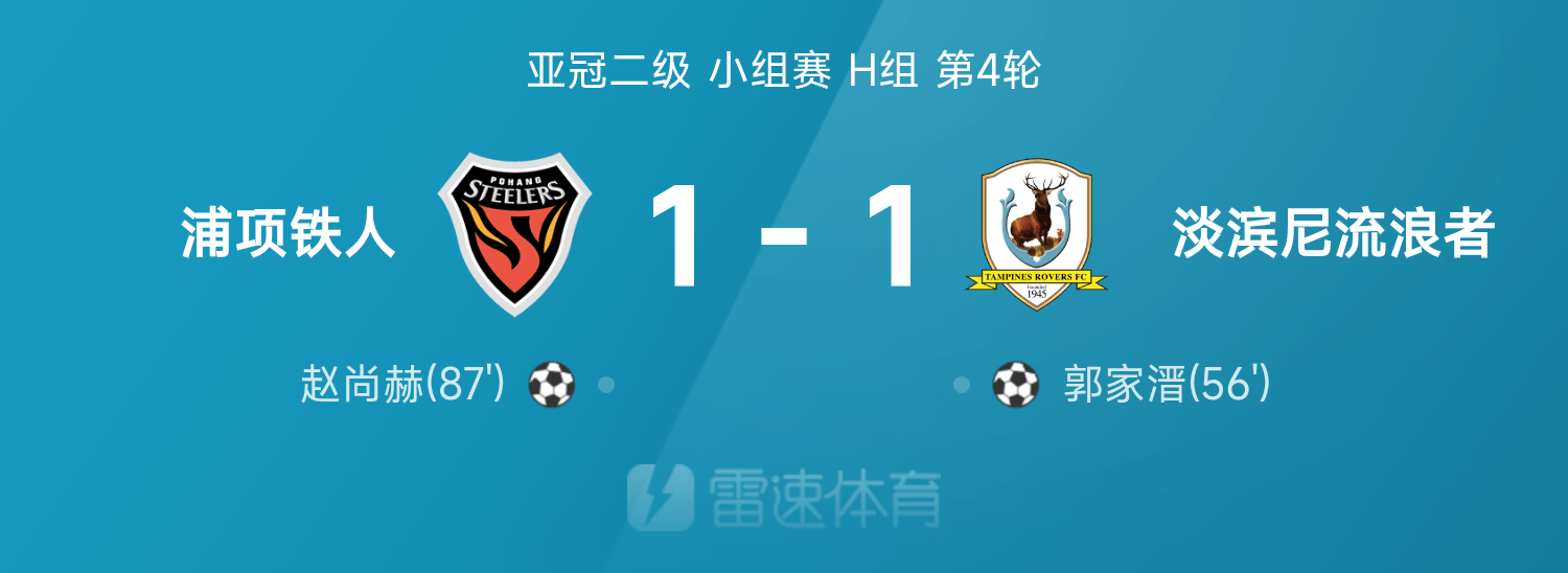 亚冠二级战报:郭家溍破门,赵尚赫绝平,浦项1-1淡滨尼