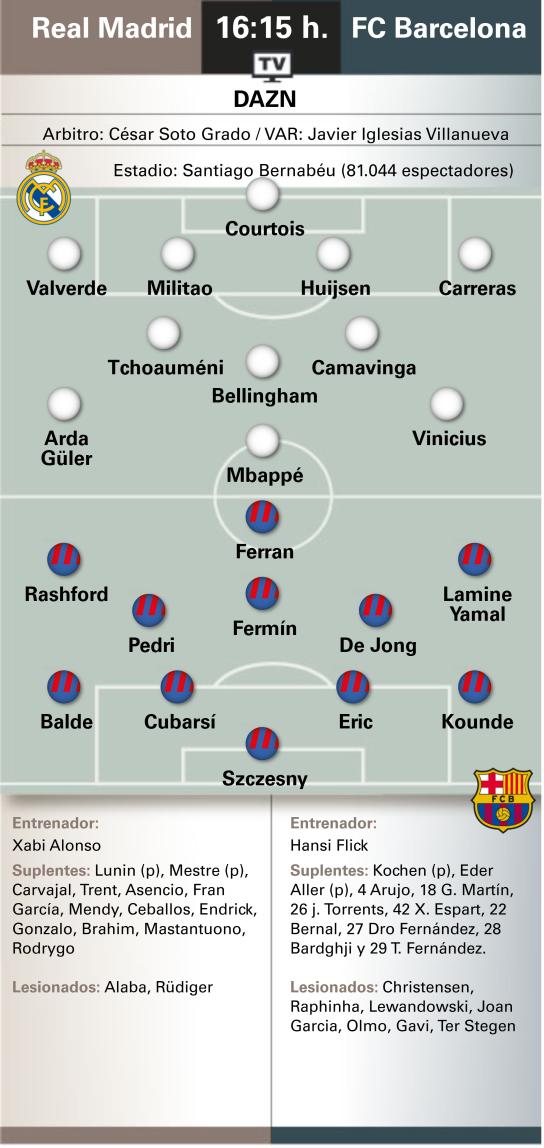 6686体育10月26日讯 北京时间今晚23点15分,西甲国家德比将在伯纳乌上演。皇家马德里主队场迎战巴塞罗那,这不仅是赛季首回合“国家德比”,更是一场争夺榜首的直接对话——如果取胜,巴萨将逆转局皇马登顶积分榜。赛前,《世界体育报》对两队首发进行了预测。