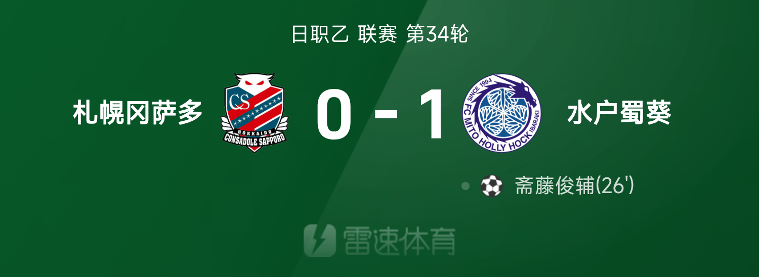 日职乙战报:斋藤俊辅制胜,札幌冈萨多0-1水户蜀葵