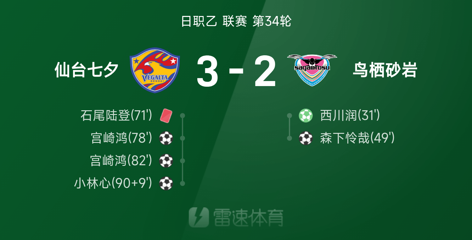 日职乙战报:小林心补时最后一投,十人仙台七夕3-2逆转鸟栖砂岩