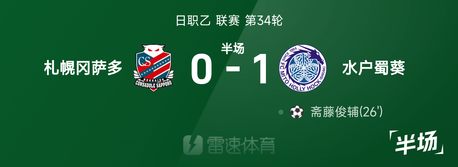 日职乙半场:斋藤俊辅破门,札幌冈萨多0-1水户蜀葵