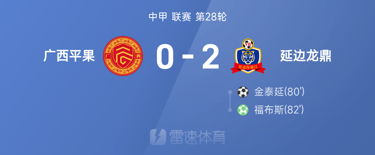 6686体育10月26日讯 25赛季中甲联赛事第28轮,延边龙鼎2-0战胜广西平果。全场竞赛,福布斯、金泰延破门建功。