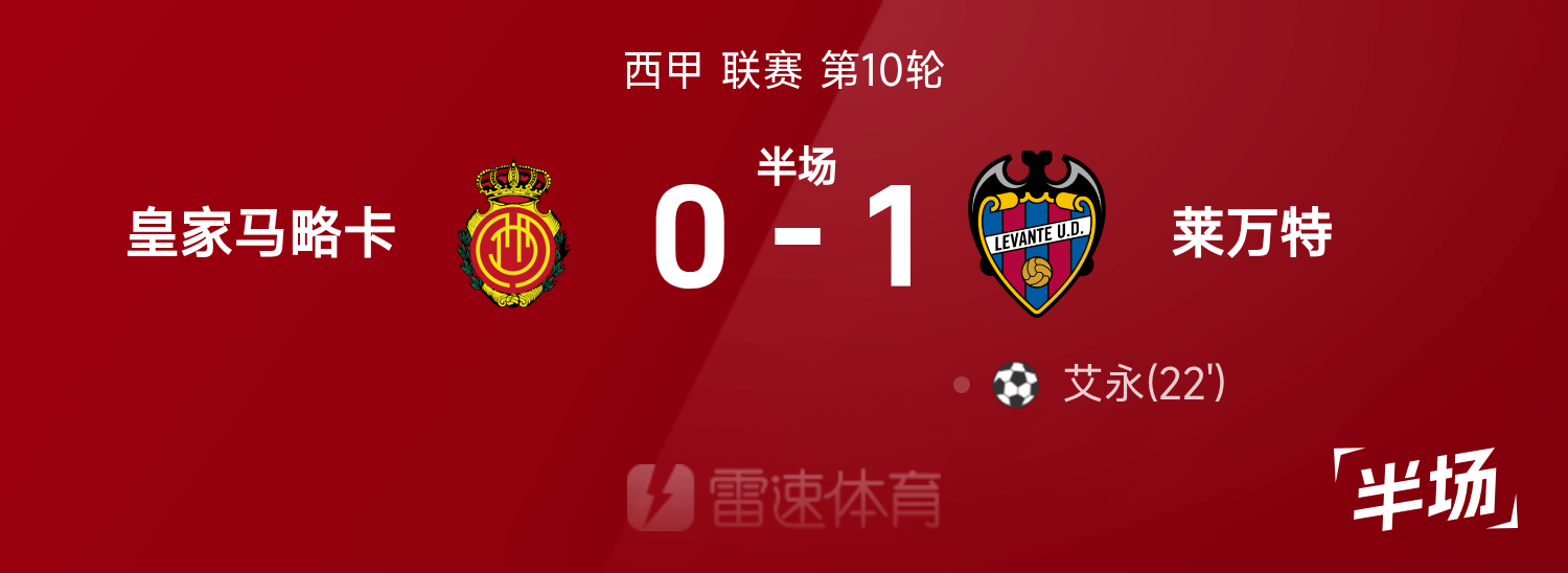 西甲半场:艾永推远角建功,莱万特暂1-0马略卡