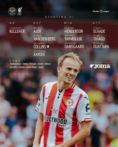 布伦特福德首发:1-凯莱赫、20-阿耶尔、4-范登贝赫、22-柯林斯、33-卡约德、6-亨德森、18-亚尔莫柳克、24-达姆斯高、7-沙德、9-蒂亚戈、19-瓦塔拉