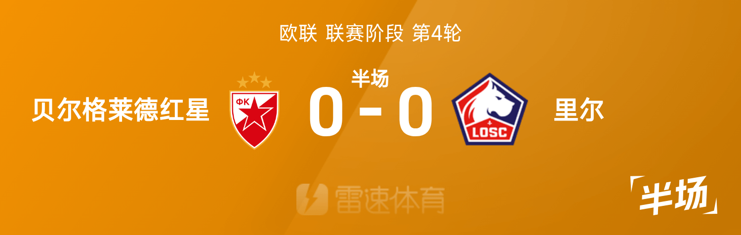 欧联半场:场上僵局暂未打破,贝尔格莱德红星0-0里尔