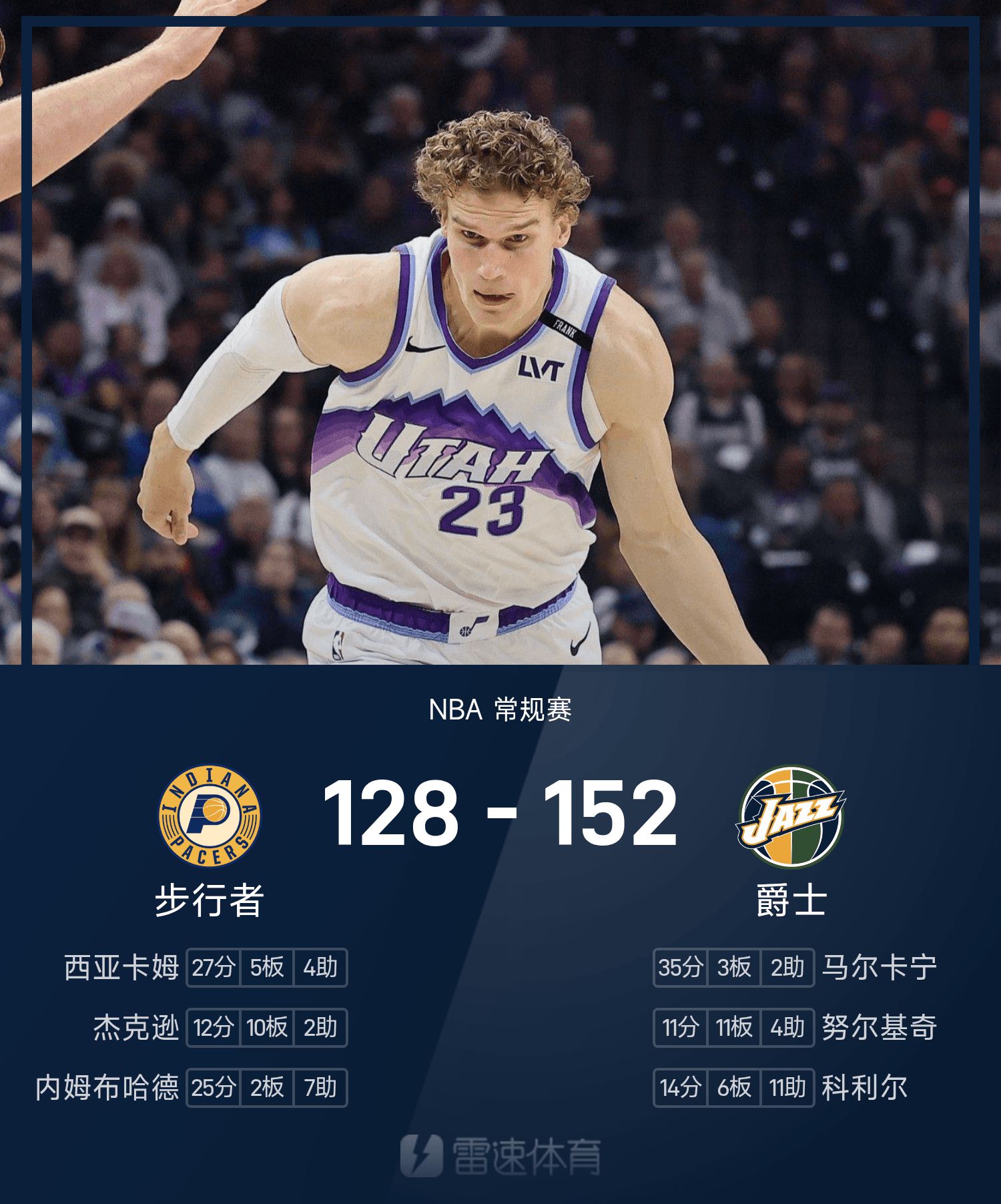 NBA战报:马尔卡宁35分,爵士152-128大胜步行者