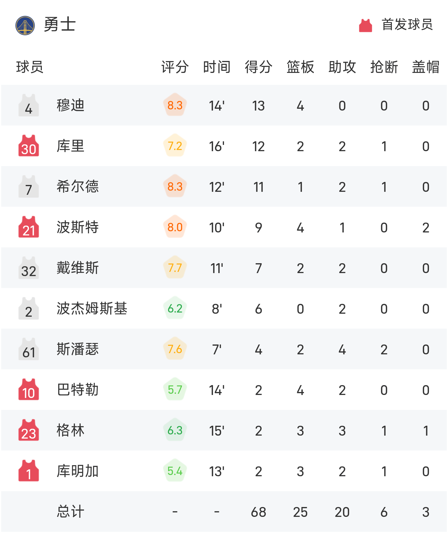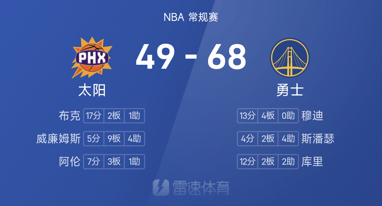 NBA半场:穆迪13分,勇士10分得分,勇士68-49大赛果分领跑位太阳