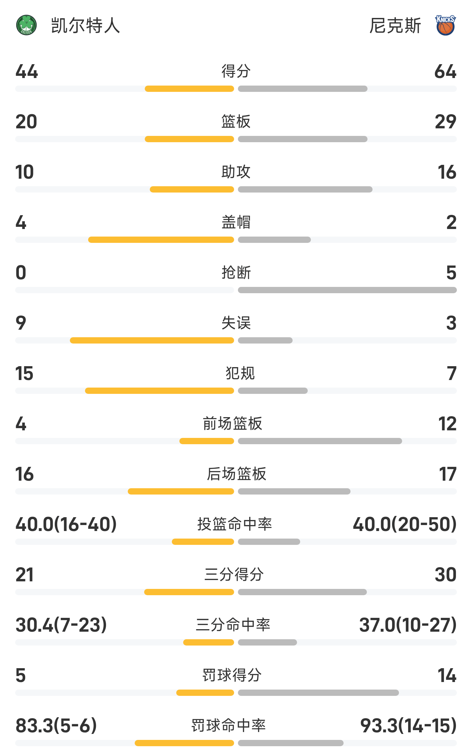 6686体育10月25日讯 25/26赛季NBA 常规赛,尼克斯对阵凯尔特人。双方半场战罢,尼克斯64-44领跑位凯尔特人。