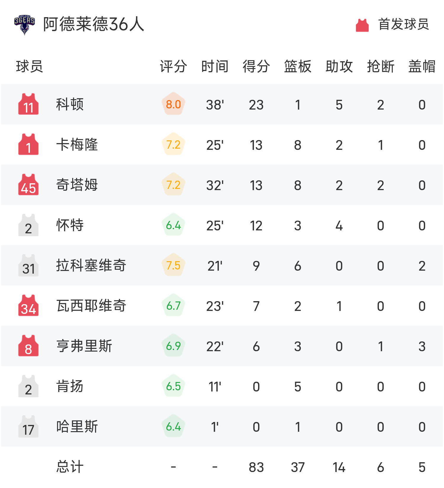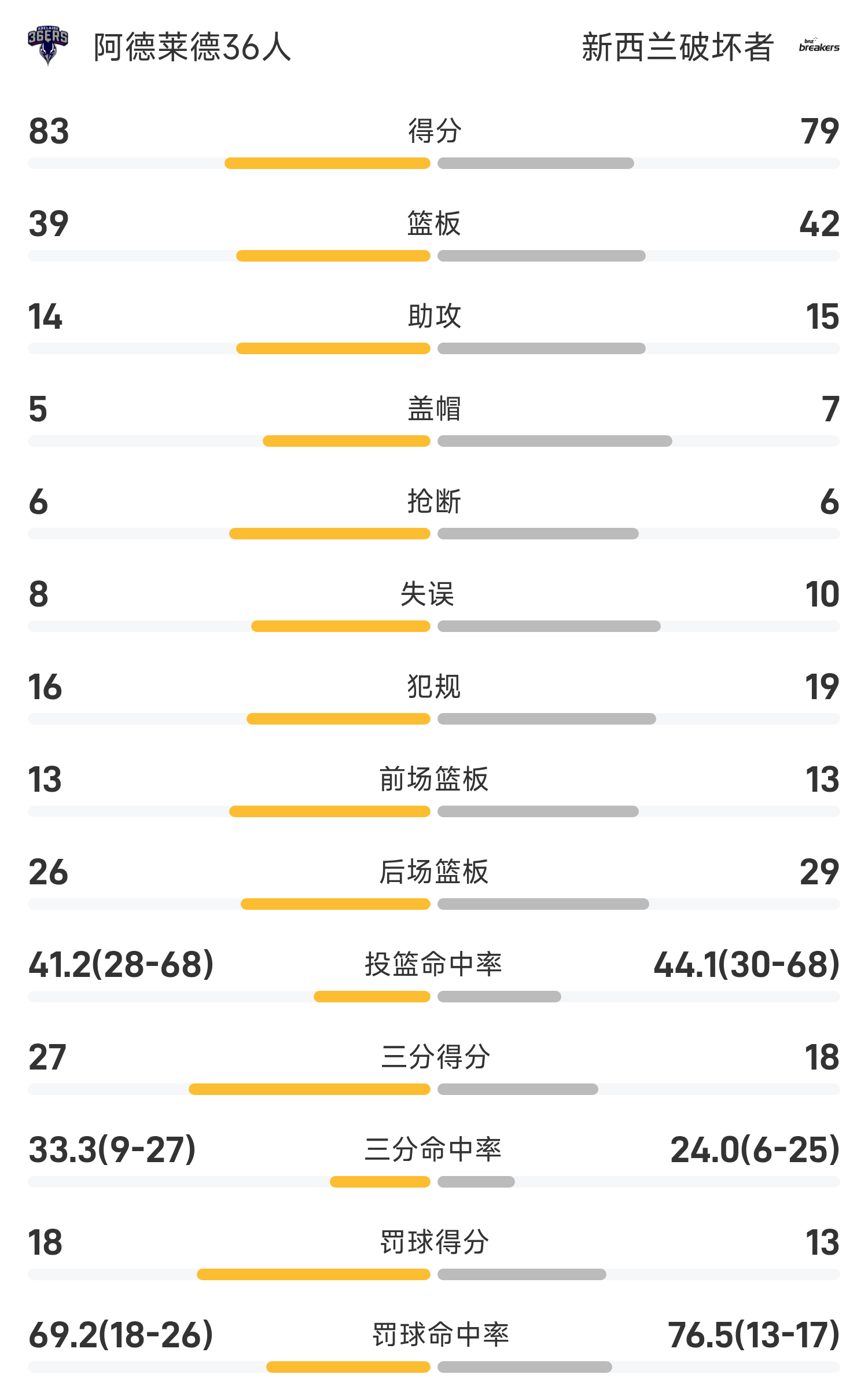 NBL战报:科顿23分,阿德莱德36人83-79险胜新西兰毁坏者